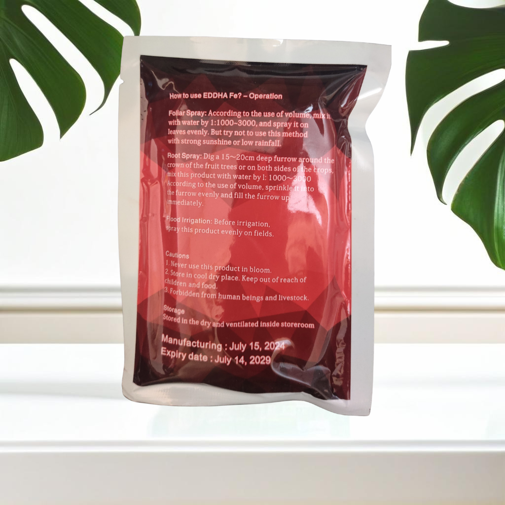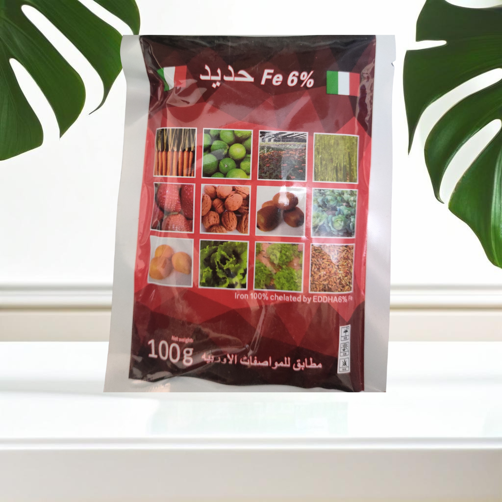 الحل هو هذا السماد، حديد مخلبي EDDHA 6%، وهو يعتبر أفضل وأقوى نوع حديد مخلبي مناسب لتربتنا.