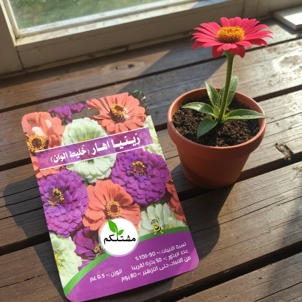 شاهد هذه الصورة الجميلة... من هذا الكيس الصغير المليء بالوعود، يمكنك أن تزرع بيديك وردة زاهية ومشرقة تماماً كتلك التي في الأصيص. نقدم لك بذور زهور الزينيا، بوابة الدخول إلى عالم من الألوان الصيفية التي لا تخشى شمس البصرة الحارقة.